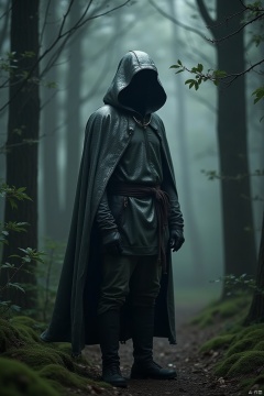 cyberNature, forest, nature, solo, tree, hood, outdoors, full body, cloak, standing, looking at viewer, no humans