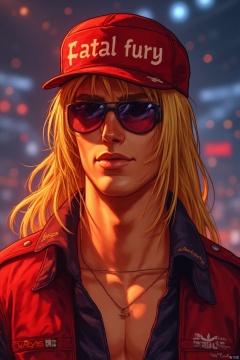 22years old, terry bogard, wearing a red duckbill hat, with the words "fatal fury" printed on the front of the hat,profile