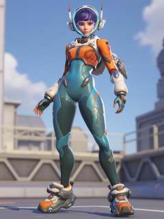 Juno from Overwatch 2 in a sleek cybernetic suit, striking a powerful yet calm pose atop a futuristic cityscape, with a cool, stoic expression. The digital art should emphasize her unique design, high-tech armor, and the atmospheric backdrop, <lora:juno_overwatch_2:1>
