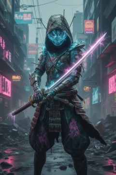 A sharp, focused shot of a Circuit-Slasher standing amidst a rain-soaked urban battlefield. The samurai-like figure wields a glowing katana, its blade sparking with electrical surges as it slices through the air. Their cybernetic arms are adorned with graffiti-like designs, and their armor is a blend of traditional samurai plating fused with futuristic, glitching tech. The Circuit-Slasher’s visor reflects neon signs from the surrounding ruins. Behind them, shattered holographic billboards flicker, and the hum of digital interference echoes through the alleyways. The atmosphere feels cold and detached, yet alive with digital energy..Avatarwar