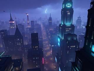 Gotham City, expansive nighttime cityscape, colossal urban sprawl stretching to the horizon, impossibly tall skyscrapers piercing the clouds, art deco and gothic architecture blended with futuristic elements, neon lights in vibrant blues and purples illuminating the perpetual darkness, holographic advertisements floating between buildings, smog-filled air creating an eerie glow, narrow streets far below teeming with hover-cars and cyberpunk vehicles, ominous gargoyles perched on building corners, distant lightning flashes revealing the city's silhouette, a faint bat signal visible in the cloudy sky, reflective glass facades mirroring the city lights, dark alleys contrast with brilliant neon signs, flying drones patrolling between buildings, monorail tracks weaving through skyscrapers, massive industrial smokestacks in the distance, hyper-detailed urban environment, moody and atmospheric, 8K resolution, photorealistic rendering, <lora:gotham-city-gotham-knights:1>