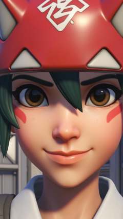 Kiriko a young girl character in the Overwatch video game is depicted in a close-up 3D-rendered image. She has short dark green hair styled in a pixie cut with bangs. Her skin tone is light and her eyes are large and almond-shaped with dark brown irises. She wears a red headband with white and black Japanese kanji characters on it covering her forehead and part of her ears. Her facial expression is neutral with a slight hint of a smile. Her lips are full and pink and she has a small mole on her right cheek. She is wearing a white scarf around her neck. The background is blurred but it appears to be a dimly lit room with metallic surfaces suggesting an industrial or futuristic setting. The lighting is soft and diffused casting subtle highlights and shadows on her face enhancing the texture of her skin and the smoothness of her headband. The overall style of the image is highly detailed and realistic typical of modern video game character art, <lora:kiriko-overwatch-2-v2:1>