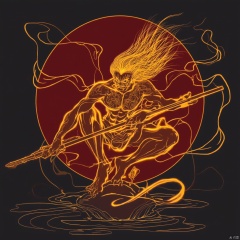 photograph fiery orange and yellow illustration of a demon holding a staff crouching on a round object surrounded by swirling lines dark red background intense and dynamic pose detailed facial features intense gaze dynamic and powerful detailed and detailed dynamic composition high contrast intense yet powerful., eastern-mythology, golden-line, solo, long hair, hair floating in the air, 1boy, demonic face, holding, full armor, male focus, barefoot, tattoo, muscular, smoking pipe, kiseru