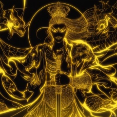 photograph neon-lit warrior in traditional chinese attire holding a sword flanked by two dragons glowing yellow and black background intense gaze long flowing hair dynamic pose intense expression dynamic and powerful ethereal and mystical atmosphere detailed and detailed high-angle shot vibrant and detailed., eastern-mythology, solo, long hair, golden-line, looking at viewer, smile, 1boy, full armor, holding, male focus, glowing, staff, holding weapon, glowing eyes, robe, snake