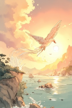 The divine bird Jingwei Fuhai in Eastern mythology,with stone in the mouthflies to the sea, masterpiece, official art is extremely exquisite, sunrise, gorgeous morning light, distant Jinshan, soaring in the clouds, vast sea, turbulence, the sea shines with golden and red light, dazzling light, Chinese mythology, sea, fairyland divine bird, the rising sun constitutes an intoxicating beauty.