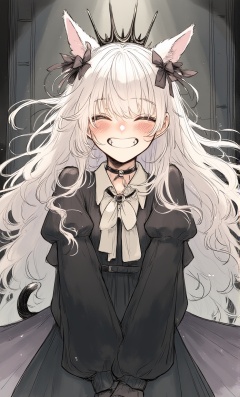1cat, laugh, crazy, beautiful, white hair, dark fairy tale, black crown, evil vibe, Gothic style