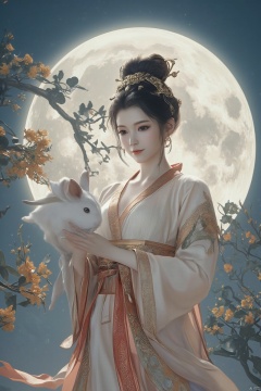 Best quality, Realistic, photorealistic, masterpiece,In the style of illustration, a mythical woman Chang 'e holds a white rabbit in her hands, with a full moon and an osmanthus tree behind her,Xyunxiao,(big breasts:1.99),Xxiaolongnv,Xyuanyao,Xtifa,XAerith
