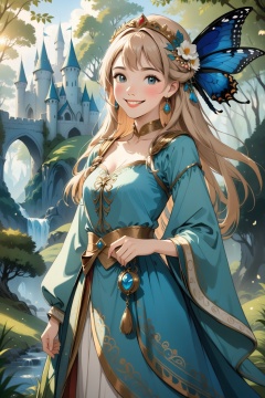 a maiden in a lovely costume,smiling and standing in front of a background full of fantasy elements,