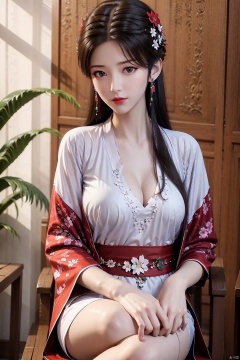 8K image.black hair,GG,,苏檀儿-赘婿,1girl, solo, breasts, looking at viewer, large breasts, brown hair, hair ornament, dress, cleavage, bare shoulders, sitting, collarbone, flower, indoors, hair flower, hair bun, window, chair, chinese clothes, red dress, table, red flower, red lips