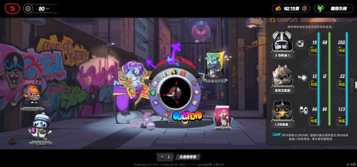 The interface presents a fierce graffiti racing challenge. The backdrop is a bustling city wall covered with unfinished graffiti, which players have a limited time to complete. The central timer is designed in the shape of a giant spray can, with colored smoke rising from the mouth of the spray can and dissipating over time. The left side shows the current player's score and graffiti progress, in the form of spray paint pattern. The right side shows other players' progress bars, along with their avatars and score leaderboards