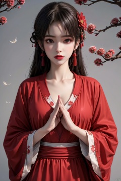 8K image.black hair,GG,,1girl, solo, long hair, looking at viewer, black hair, hair ornament, long sleeves, dress, jewelry, collarbone, upper body, flower, earrings, hair flower, wide sleeves, grey background, nail polish, makeup, chinese clothes, red dress, own hands together, branch, red lips, hanfu