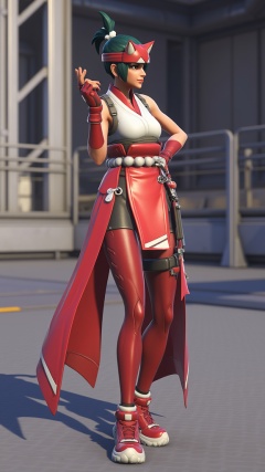 Kiriko a young girl character in the Overwatch video game series is depicted. She stands confidently in a dynamic pose with her right leg slightly forward and her left arm bent at the elbow fingers splayed as if she's about to make a gesture. She wears a vibrant red outfit with white and black accents. Her hair is styled in a short bob and adorned with a red and white headband. Her outfit includes a white sleeveless top with a high collar and a red scarf tied around her neck. A long flowing red cape drapes over her shoulders and down her back adding a sense of movement and dynamism to her appearance. She also wears red fingerless gloves and knee-high red boots with white accents. The background features an industrial setting with metallic structures and pipes suggesting a futuristic or sci-fi environment. The ground appears to be a metallic surface with a grid pattern. The overall color palette is dominated by shades of red white and black complemented by the cool tones of the metallic structures in the background. The image has a high level of detail and vibrancy typical of high-quality digital art, <lora:kiriko-overwatch-2-v3:1>