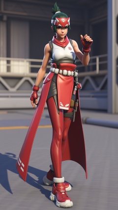 Kiriko a young girl character in the Overwatch video game series is depicted. She stands confidently in a dynamic pose with her right leg slightly forward and her left arm bent at the elbow fingers splayed as if she's about to make a gesture. She wears a vibrant red outfit with white and black accents. Her hair is styled in a short bob and adorned with a red and white headband. Her outfit includes a white sleeveless top with a high collar and a red scarf tied around her neck. A long flowing red cape drapes over her shoulders and down her back adding a sense of movement and dynamism to her appearance. She also wears red fingerless gloves, pants with a sleek, fitted design and high red boots with white accents. The background features an industrial setting with metallic structures and pipes suggesting a futuristic or sci-fi environment. The ground appears to be a metallic surface with a grid pattern. The overall color palette is dominated by shades of red white and black complemented by the cool tones of the metallic structures in the background. The image has a high level of detail and vibrancy typical of high-quality digital art, <lora:kiriko-overwatch-2-v3:1>