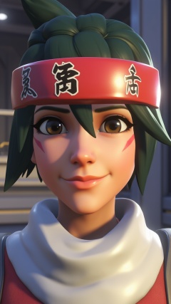 Kiriko a young girl character in the Overwatch video game is depicted in a portrait. She has short dark green hair styled in a pixie cut with bangs. Her skin tone is light and her eyes are large and almond-shaped with dark brown irises. She wears a red headband with white and black Japanese kanji characters on it covering her forehead and part of her ears. Her facial expression is neutral with a slight hint of a smile. Her lips are full and pink and she has a small mole on her right cheek. She is wearing a white scarf around her neck. The background is blurred but it appears to be a dimly lit room with metallic surfaces suggesting an industrial or futuristic setting. The lighting is soft and diffused casting subtle highlights and shadows on her face enhancing the texture of her skin and the smoothness of her headband. The overall style of the image is highly detailed and realistic typical of modern video game character art, <lora:kiriko-overwatch-2-v3:1>