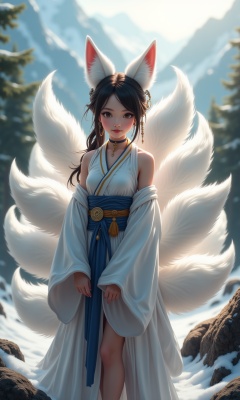 According to Chinese mythology,the Nine Tailed Fox has nine oversized fluffy tails and white fox ears. It stands out for its makeup,Chinese clothing,hair accessories,jewelry,earrings,wide sleeves,exposed shoulders,and semi transparent presence on snowy mountains. The image is messy,but filled with incredibly rich details,creating a realistic visual effect.,1girl,solo,tail,animal ears,fox tail,fox ears,outdoors,multiple tails,looking at viewer,full body,standing,day,bangs,backlighting,nature,swept bangs,sash,tree,long sleeves,facial mark,black hair,breasts,sidelocks,forest,lips,wide sleeves,choker,fox girl,brown eyes,smile,animal ear fluff,japanese clothes,collarbone,brown hair,sunlight,long hair,multicolored hair,arms at sides,obi,blurry,frills,braid,medium breasts,parted lips,hair ornament,tabi,
