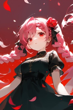 masterpiece, (aesthetic style:0.7), 1girl, solo, looking at viewer, braid, pink hair, floating hair, from below, long hair, black dress, short sleeves, red flower, twintails, closed mouth, red eyes, gradient background, petals