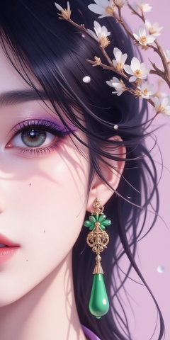 XSHDHAn eye-level view of a woman's facethe eye is adorned with purple and green eyeshadow. The woman's eyes are surrounded by longwavy black hairand she is wearing a pair of dangling dangling earrings. The earrings are green and goldand the woman's hair is a darker shade of black. The background is a light pinkand there is a branch of a tree in the upper right corner of the frame. <lora:lora.by_tusi (7):1>