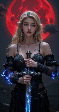 ArsMJStyle, dnddarkestfantasy, portrait of blonde nordic swordswoman, erotic, sensual lace see-through clothing, cleavage, neval piercing, holding a sword by the hilt, sword pulsing with blue electrical energy, red moon, dark clouds, atmospheric, direct gaze, moody, arousing, sensual, steamy, atmospheric, masterpiece, BREAK, highest definition, HD32K, wallpaper, hyperdetailed, concept art
