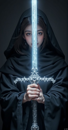 smooth, sharp, perfect composition, UHD, dark fantasy, retro filter, trending on artstation, detailed and ornate intricate masterwork sword imbued with a bright white glow that is very bright, hooded dark female mage, (focus on sword), female,
