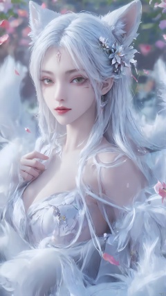 1girl, animal ears, solo, green eyes, dress, tail, flower, facial mark, white dress, white hair, hair ornament, hair flower, long hair, blurry background, jewelry, looking at viewer, earrings, blurry, fox ears, petals, fox tail, hand on own chest, lips, detached sleeves, breasts, animal ear fluff, see-through, smile