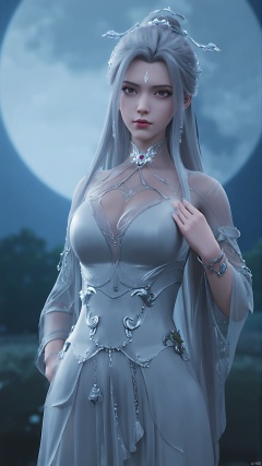 girl, moon, jewelry, necklace, solo, bracelet, white hair, earrings, facial mark, long hair, night, hair ornament, looking at viewer, bare shoulders, full moon, forehead mark, upper body, red lips, dress