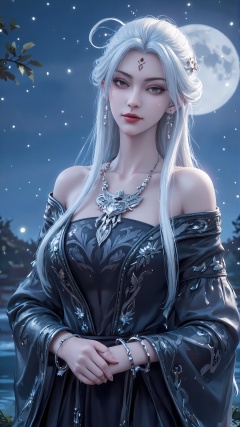girl, moon, jewelry, necklace, solo, bracelet, white hair, earrings, facial mark, long hair, night, hair ornament, looking at viewer, bare shoulders, full moon, forehead mark, upper body, red lips, dress