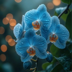 A close-up view of a cluster of blue orchids with water droplets on them. The background is blurred