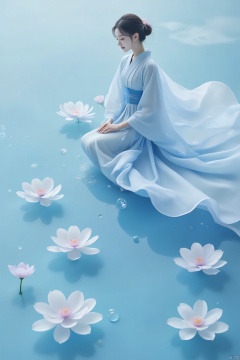 and there are water droplets floating on the surface of the water. The woman's dress is flowing in a flowing pattern