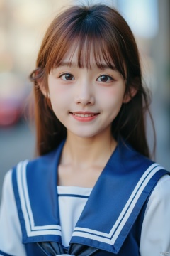 Very beautiful cute girl) (very cute face:1.2),(baby face),(sparking clear attractive large eyes:1.2), Beautiful detailed eyes, Detailed double eyelids, smiling, (realistic photograph:1.1), in the street,