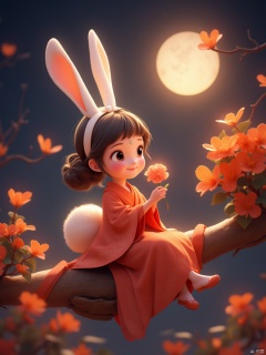 In a serene midnight blue setting, a medium-sized cartoon rabbit sits poised on a curved wooden branch wrapped in a vibrant red ribbon. Dressed in a crimson kimono, the rabbit cradles a delicate pink flower in her hand. Her dark brown locks flow down her back like a waterfall, secured by a white headband and tied into a ponytail. Two sparkling white eyes gaze softly ahead. A gleaming white bow adorns her forehead, adding a touch of whimsy to the scene. In the upper right corner, a glowing moon casts a silvery light, surrounded by a bouquet of bright orange flowers that burst forth in a splash of color against the dark background.