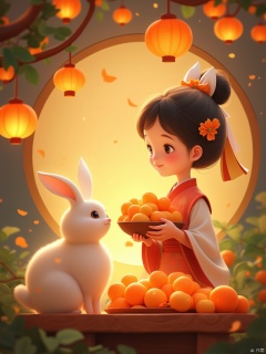 Softly lit serene Japanese garden setting: a medium-Asian girl, adorned with a white bow and flowers in her hair, holds a bowl of oranges against a tranquil backdrop of orange lanterns hanging from a tree branch. To her left, a curious white rabbit sits on a wooden table, eagerly awaiting the juicy oranges. Framed by lush greenery, the scene exudes peaceful harmony.