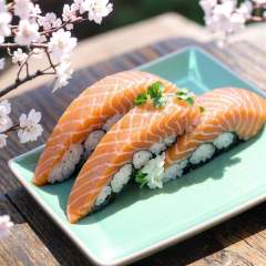 Salmon sushi,Delicious sushi,asake_ameji,japanese theme,cherry_blossoms,still life,no humans,food photography,unique perspective,((fire)),((close-up)),((glowing)),((blurry)),Highly detailed,(ultra-detailed),(best quality,masterpiece:1.5),qx,