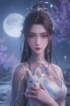 In a dreamlike scene, a woman embodying the Chang'e beauty stands out against a vibrant, fluorescent background teeming with stars. Her clean and beautiful face radiates serenity as she wears a kaleidoscope of colors that seem to shift and shimmer in harmony with the celestial bodies above. She holds a white rabbit close to her heart, while the glowing moon casts an ethereal light on the entire composition.,black hair,facial mark,blue forehead mark,GF