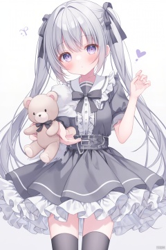 1girl, solo, long hair, looking at viewer, blush, bangs, shirt, thighhighs, dress, bow, holding, twintails, very long hair, closed mouth, purple eyes, short sleeves, hair bow, grey hair, frills, puffy sleeves, black thighhighs, sailor collar, black dress, collar, puffy short sleeves, hands up, black bow, stuffed toy, frilled dress, stuffed animal, sailor dress, teddy bear, white sailor collar, :t, pout, grey dress, grey sailor collar, frilled sailor collar