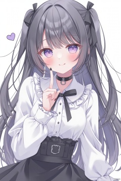 1girl, solo, long hair, looking at viewer, blush, smile, bangs, skirt, shirt, black hair, long sleeves, white background, bow, very long hair, purple eyes, white shirt, :d, hair bow, heart, frills, choker, puffy sleeves, collared shirt, hand up, black skirt, nail polish, two side up, sleeves past wrists, black bow, black choker, black nails, index finger raised, puffy long sleeves