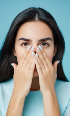 The image is a portrait of a young woman with long dark hair.    The woman is covering her face with her hands, with her fingers resting on her cheeks.    She has a serious expression on her face and is looking directly at the camera.    The background is a light blue color, making the woman the focal point of the image. , <lora:hand XLv5.11:1>,