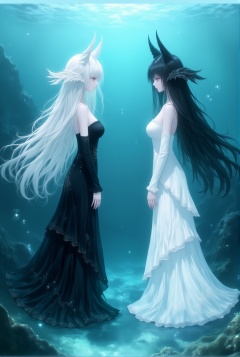 long hair, dress, black dress, 2girls, multiple girls, black hair, underwater, wings, fins, detached sleeves, head fins, white hair, air bubble, profile, white dress, bubble, long sleeves, bare shoulders, from side, strapless dress, breasts, black wings, very long hair, black vs white, strapless<lora:黑白天使:1>