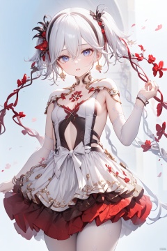 (score_9,score_8_up,score_7_up), (masterpiece),( beautiful),(high quality),(finely detailed),extremely detailed CG unity 8k wallpaper,best quality, 1girl, solo, breasts, looking at viewer, bangs, black hair, hair ornament, gloves, dress, hair between eyes, twintails, jewelry, white hair, multicolored hair, earrings, small breasts, sky, white dress, two side up, streaked hair, grey eyes, asymmetrical clothes, white background, camellya, cowboy shot