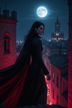 Luna Valen glides through the ancient city, her black leather jacket fluttering in the cool night air. The moonlight bathes the stone buildings as her crimson eyes scan the streets from a cathedral rooftop. Silent and swift, she moves like a shadow, always watching over the vulnerable. In a dark alley, a group of thugs harasses an innocent, but before they know it, Luna appears, her presence freezing them in fear. "There’s no place for evil here," she whispers, her voice calm yet authoritative. With a swift motion, they flee, and Luna vanishes back into the shadows, leaving only the memory of her protection. vibrant colors,magenta and dark red colors.(masterpiece,best quality,32K,UHD,HDR,realistic,detailed,sharp focus,high contrast,rule of thirds,depth of perspective,award-winning photo,chiaroscuro lighting),beauy_ks01