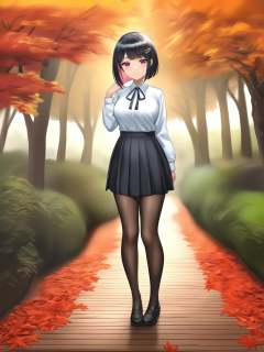 artist:toinor,1girl,skirt,solo,pantyhose,shirt,full body,black hair,white shirt,black footwear,pleated skirt,black skirt,short hair,smile,black pantyhose,shoes,hair ornament,colored inner hair,long sleeves,looking at viewer,collared shirt,multicolored hair,hairclip,standing,closed mouth,shirt tucked in,breasts,pink hair,mary janes,ribbon,bob cut,school uniform,simple background,hand up,two-tone hair,neck ribbon,black ribbon,pink eyes,(autumn maple forest:1.3),(very few fallen leaves),(path),
