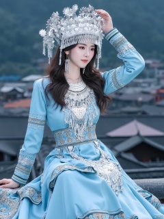 A young girl wearing a silver Miao ethnic headdress,a woman dressed in a traditional Chinese dress, adorned with a silver crown on her head. She is seated on a rooftop rooftop, her hands resting on her hips, adding a touch of balance to the scene. In the background, a row of houses can be seen, their roofs are covered in a variety of colors, adding depth to the composition.