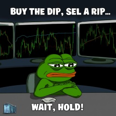 Pepe sitting in front of multiple monitors, intensely staring at stock market charts that are constantly fluctuating. His face alternates between panic and excitement. The caption reads: "Buy the dip, sell the rip... wait, HOLD!" It's a humorous take on the emotional rollercoaster of day trading.
