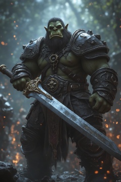 World of Warcraft, orcs, warriors, great swords, cg rendering, movie lighting,全身照,