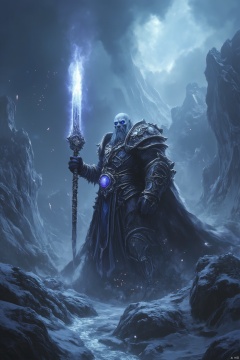 World of Warcraft, Lich King, glowing sword, frozen mountains, frozen rivers, glowing eyes