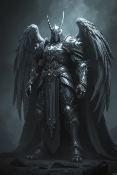 A majestic silver warrior stands tall, donning a gleaming helmet adorned with intricate designs. Winged extensions sprout from their shoulders, shimmering in harmony with their metallic armor. The subtle curves of the armor plate accentuate the warrior's defined physique, as they pose triumphantly against a dark, misty backdrop, their wings spread wide in a powerful gesture.