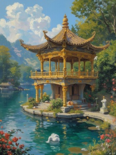 OByouhua,oil painting,digital illustration depicting a whimsical, fairytale-like scene. The central focus is a small, ornate pavilion with a golden roof, nestled on a floating platform in a serene, turquoise lake. The pavilion is adorned with intricate golden details and has a small,