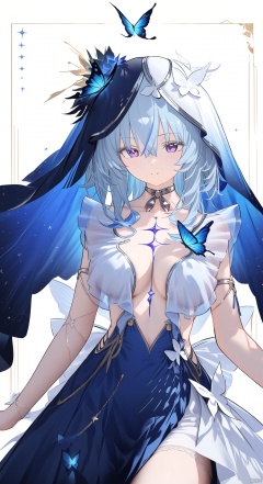 (score_9,score_8_up,score_7_up), (masterpiece),( beautiful),(high quality),(finely detailed),extremely detailed CG unity 8k wallpaper,best quality, 1girl, solo, long hair, breasts, bangs, hair ornament, dress, cleavage, hair between eyes, medium breasts, blue hair, purple eyes, alternate costume, choker, white dress, bug, butterfly, veil, blue butterfly, white background, shorekeeper, cowboy shot