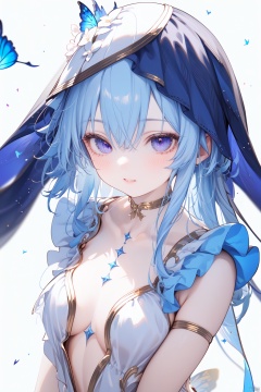 (score_9,score_8_up,score_7_up), (masterpiece),( beautiful),(high quality),(finely detailed),extremely detailed CG unity 8k wallpaper,best quality, 1girl, solo, long hair, breasts, bangs, hair ornament, dress, cleavage, hair between eyes, small breasts, blue hair, purple eyes, alternate costume, choker, white dress, bug, butterfly, veil, blue butterfly, white background, shorekeeper, cowboy shot