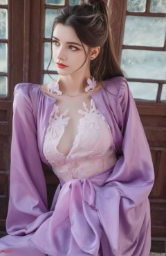 1 Beauty in Hanfu,Thin Purple silk shirt,White,Variety of textures,White lace top, Platinum long ponytail,hair accessories,earring,light pulse rabbit ears,Necklaces and Necklaces, Detailed eyebrows,high mise face, breasts breasts, cut red, slim wave, Purple fishnet stockings,Chinese Hanfu style,fictional art texture,The colors are vivid and true to life,original photo,Realistic photos,Ultra-high quality 8k hyper-realistic photos,(Effective fantasy lighting effects:1.8),10x pixels,magic effect (background):1.8),super detailed eyes, portrait girl, background girl,eluosi