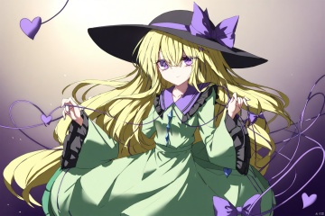 masterpiece,best quality,illustration,ultra detailed,hdr,Depth of field,(colorful),Artist rokusai,1girl,yellow hair,third_eye, green shirt, black_hat,frilled_sleeves,frilled_shirt_collar, wide_sleeves, hat_bow, green_skirt, heart_of_string, purple_bow, hat_ribbon, diamond_button, yellow_ribbon,YakumoKoishi,purple eyes,